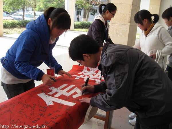 此次活动形式多样,上午11点,我院团委学生会就在南校区食堂门口和北校区逸夫楼停车场上开展了法制宣传系列活动。工作人员分发传单,向过往的同学们宣传基本的法律知识,组织他们在横幅上签名,并在展板上写下自己对法和法制的认识与看法。同学们踊跃参加,极大地体现了同学们对法律的关注与热情。此外,在北校区,我院团委学生会还展示了法律文化作品,书法、漫画等,而且还举行了法律知识有奖竞猜游戏,同学们热情高涨,在一问一答中法律知识得到宣传。