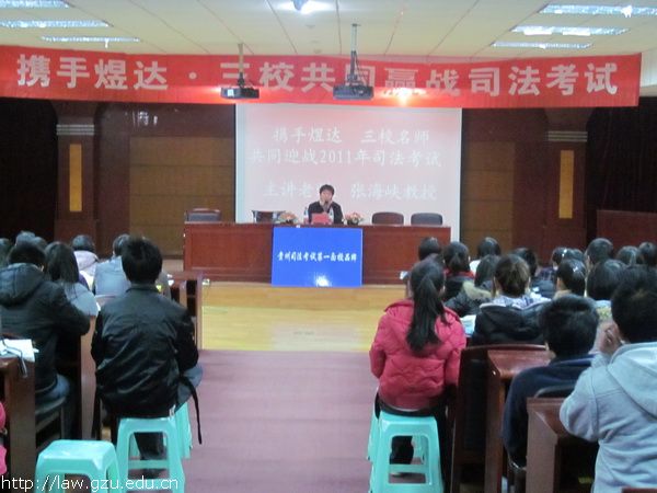 2010年12月7日16点半,“煜达三校名师”司法考试培训机构共同迎战2011年司法考试讲座在贵州大学模拟法庭举行,主讲人是国内著名的中青年法学教育工作者、学者张海峡教授。众多学生慕名前来听讲座,整个模拟法庭座无虚席。