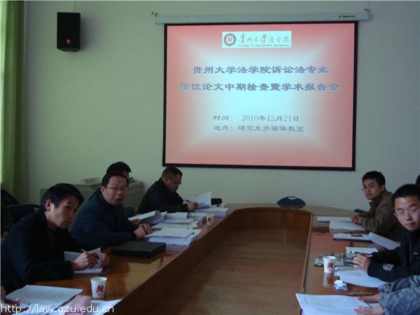 2010年12月21日下午二点半在研究生多媒体教室举行了我院诉讼法硕士点论文中期检查暨学术报告会。出席此次会议的有我院副院长余贵忠教授、李卫国教授、穆昌亮教授以及08级、09级、10级全体研究生。