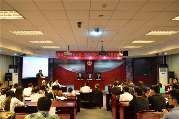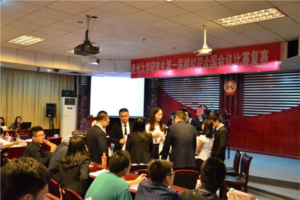 2017年6月2日19时,由贵州大学党委研究生工作部主办,金沙集团1862cc成色研究生会承办的贵州大学研究生第一届模拟联合国会议比赛的复赛在北校区模拟法庭举行,共有10支研究生队伍到场参赛。贵州大学研究生会主席武君,贵州大学研究生团委副书记王波,贵州大学三助中心主任周荧,贵研新闻社社长郭敬,贵州大学辩论队队长陈斯雨作为评委出席了此次比赛。