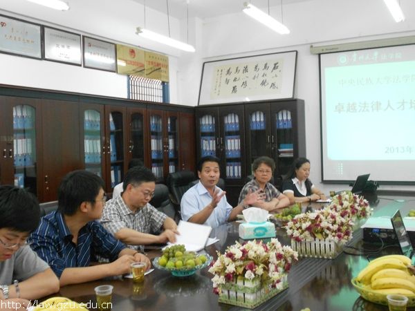 接下来,由刘爱军教授向中央民族大学法学院的各位专家学者介绍我院与会人员。接下来由程昭伦教授对我校我院情院做了简要介绍,金沙集团1862cc成色秉承“法本于德,行以弘道”的院训,多年来特别是近五年,全院广大教职工团结奋斗、求实创新,开拓进取,在法学学科的建设上取得了显著的成果:连续获得多项国家级教学与科研立项,先后被教育部确立为全国法律硕士教育综合改革试点单位、教育部“法学本科专业综合改革试点”单位、教育部“本科教学工程”大学生校外实践教育基地,在人才培养、学科建设、教育教学、科学研究、人才队伍建设和服务社会方面都取得了显著的成绩。就我院“卓越法律人才”培养方案的拟定谈了四点体会:一是“卓越法律人才”的培养是基于社会发展做出的重要举措,应注重学生法学信念、品德、知识、能力的培养,法学教育应是一种养成教育,通过各门课程的合力和大学学术氛围的涵养,共同生成大学生对法律的敬仰、对权利的捍卫、对人的尊严的发自内心的认同,形成真正的法学信仰。二是培养学生的职业能力素养,要做到“能吃苦、能适应、能创造、能奉献”,并且“动口能讲,动手能写,遇事能做,遇题能解”,要有对现行法律的批判精神和创新能力。三是学院除开设15门核心专业课外,为保障同学们掌握理论前沿问题,坚持举办名家讲堂等活动,邀请法学大家来校讲座。同司法机关、企业等对学生进行联合培养,锻炼学生对解决实际法律问题的能力。同时在平时授课过程中锻炼学生沟通能力、语言和文字表达能力、办公软件的应用能力、法律信息检索处理的能力、法庭辩论技巧等能力。四是组织教师到实务部门挂职锻炼,引进司法前线的工作人员来校兼职等方式,使教学与事务不脱节。在教学模式、学生实习、教育年限、融入司法考试到教学阶段等各方面进行改革探索,摸索一条更适合培养卓越法律人才的道路。之后张林鸿、宁立标、孙志煜、陈松针对各自负责的工作进行了补充,刘爱军做最近总结。