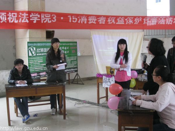 2013年3月15日,由我院主办的我院3.15消费者权益保护日活动在北区逸夫楼开展。本次活动由文艺部副部长李燕主持,活动现场人来人往,热闹非凡。