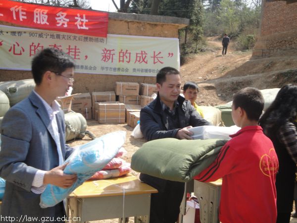 2013年3月11日中午13:30,“‘金秋•暖春’907威宁县石门营坪小学震后援助”如期举行,出席本次活动现场的有,贵州大学社会工作教育研究中心常务副主任罗俊松、威宁县教育局资助管理中心副主任李文燕,威宁县石门乡副乡长李明辉,石门乡中心小学校长陈汝娟,2011级社会工作研究生方振国、寒竹,2011级社会学研究生刘檑,2012级社会学研究生陈玲艳,以及营坪小学的全体师生。