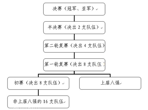 7、决赛由半决赛晋级的2支代表队进行比赛,获胜队为冠军,另一方为亚军。