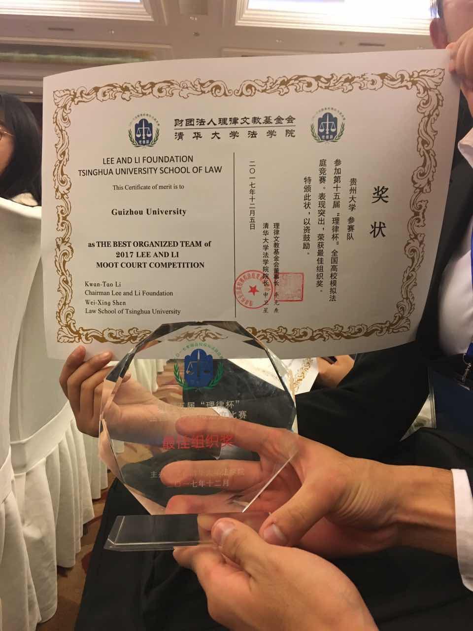 在12月5日刚刚结束的于清华大学法学院举行的第十五届“理律杯”全国高校模拟法庭竞赛颁奖典礼上,我院从四十支参赛代表队中脱颖而出,以优异的组织表现喜获“最佳组织奖”,学生领队兼参赛队员2014级吴迪同学蝉联“优秀辩手奖”。