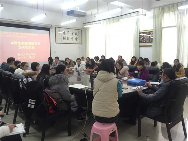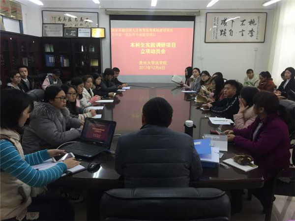 为切实做好国家卓越法律人才教育培养基地建设以及贵州省法学一流专业建设,我院本科生实践调研项目立项动员会于2017年12月6日在我院会议室召开,会议由我院副院长宁立标主持。教学科研科科长陆万莲、杨智婷老师以及欧蓉等36名申请本次实践调研项目的同学参加了本次会议。