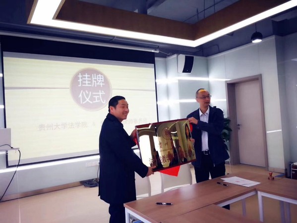 最后,贵州黔坤律师事务所贾倞主任和贵州大学我院副院长宁立标共同签订“教学实践基地协议”并为基地揭牌,挂牌仪式圆满完成。