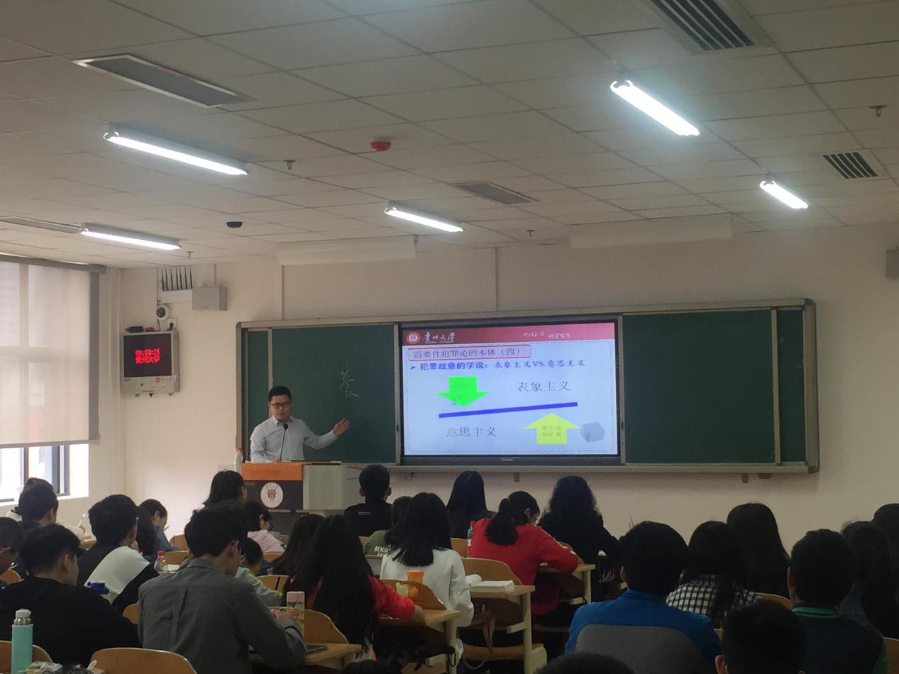 2018年5月9日上午,由曹波老师讲授的《刑法总论》课程作为此次2017~2018学年第二学期期中教学检查第一次公开课在明俊楼409D开讲。