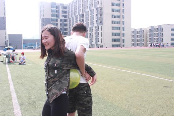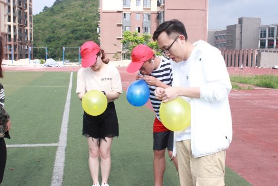 一名组员抱另一名组员下蹲5个,其他组员吹3个气球,由两人背靠背运至终点。气球运到后另外两人同时在线上穿3根针,最后用针戳爆气球,游戏结束。本轮游戏十分考验同学们的团队合作能力,同学们只有合理分工才能高效地通过游戏。