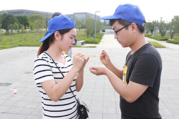 每个小组派出五人在指定区域内用筷子传递小黄豆,每个人相距5米,中途一旦豆子落地比赛重头开始。该游戏极大考验了参赛选手的专注度及抗压能力,同学们在游戏中学会了戒骄戒躁,始终保持一颗平常心。