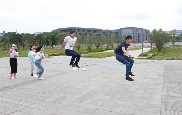 全队一起参加,两个人负责甩跳绳,其余的人依次进入跳绳,全部一起跳过10个即为成功。在游戏中,部分队伍无数次的失败无数次的重来,却始终没有放弃任务,展现着我校研究生坚持不懈和团结一致的精神。