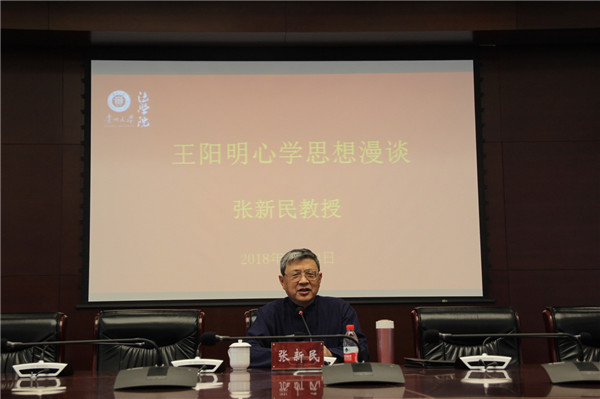 下午三时,贵州大学文化书院荣誉院长张新民教授以王阳明心学思想漫谈为题为大家授课。张教授的内容主要从良知和法律的关系、良知以及知行合一的内涵三个方面展开。张教授在讲座过程中广征博引,把中西方的哲学思想进行了比较,缓引了外国多位学者以及中国多位圣贤、学者的观点,对阳明心学进行了全面的、准确的介绍,并在讲座结束后,对同学们的相关提问进行了认真的解答。