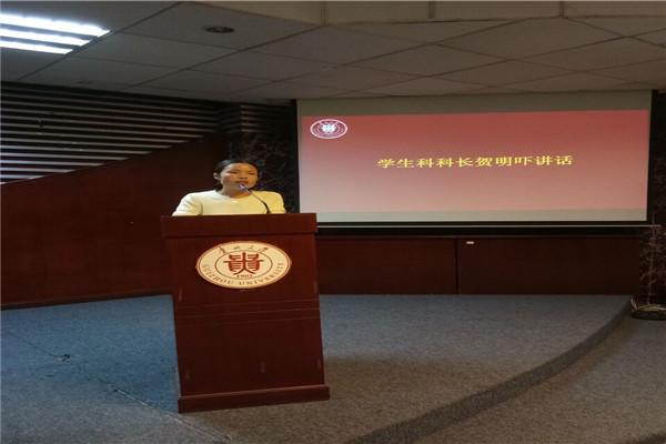 大会第三项由学生科科长贺明吓讲话,贺老师希望同学们牢固树立“安全第一”的思想,实习期间有事情一定要向学院、指导老师请假,往返途中防止交通事故,注意“防盗、防骗、防传销”,提高自己的警惕性。