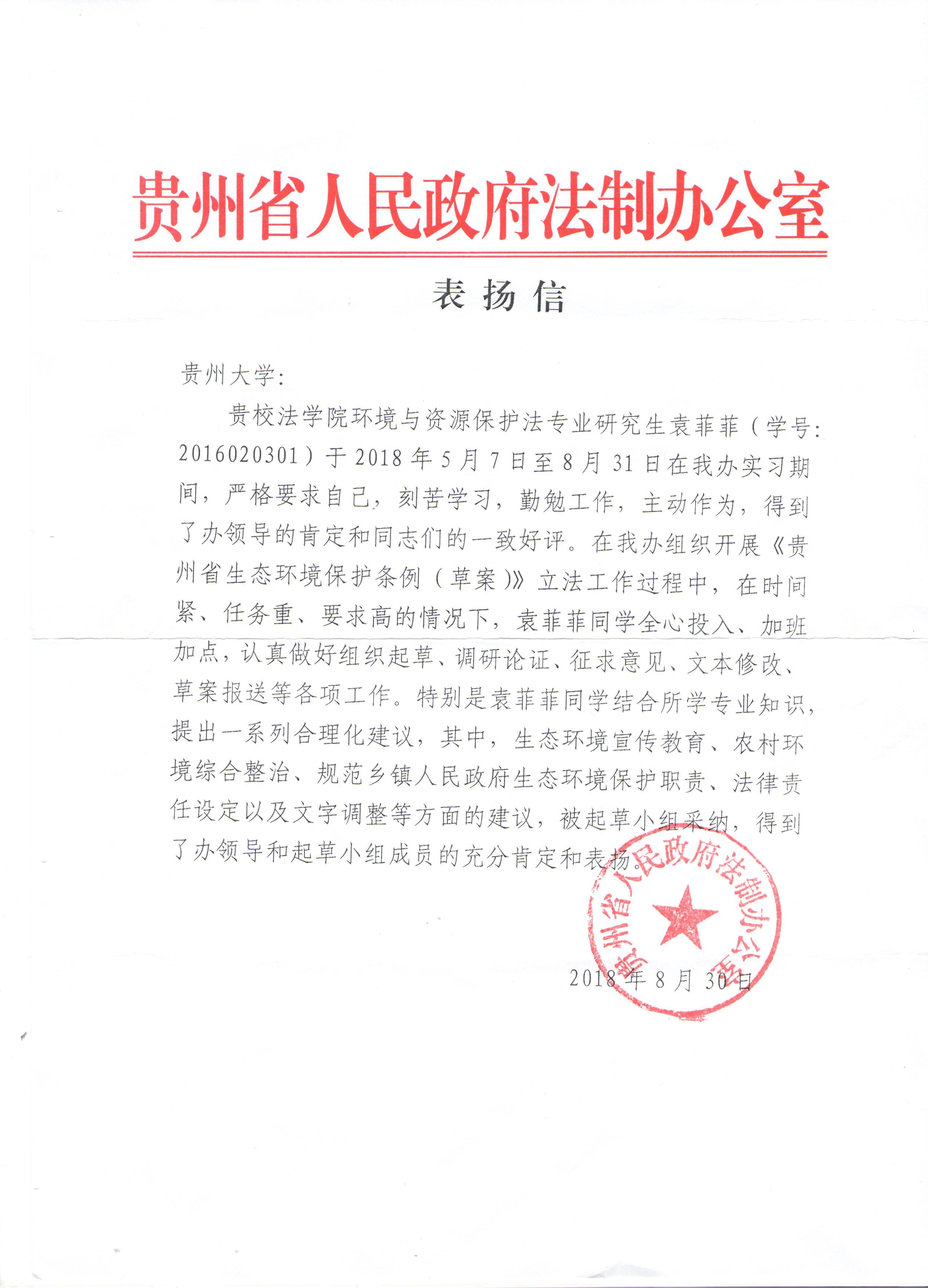 近日,我院收到贵州省人民政府法制办发来的《表扬信》,表扬我院研究生袁菲菲同学实习期间表现突出,积极参与《贵州省生态环境保护条例(草案)》的立法工作,工作认真负责,获得省政府法制办领导与同志的一致好评。