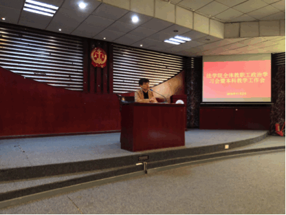 为扎实做好教学工作,推进法学一流专业建设,2018年11月2日下午14:30分,我院在模拟法庭召开了本学期本科教学工作会议,我院书记胡小兵、院长冷传莉教授、副院长宁立标教授、副书记洪影秋以及我院全体教师出席本次会议。