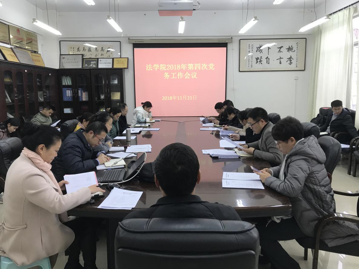 2018年11月21日中午,学院党委在学院会议室召开了2018年第四次党务工作会议,学院党委书记胡小兵、院长冷传莉、院党委副书记洪影秋以及研究生党总支负责人、全院各党支部书记、副书记参加了会议。会议由胡小兵书记主持。