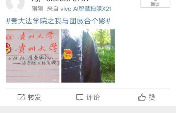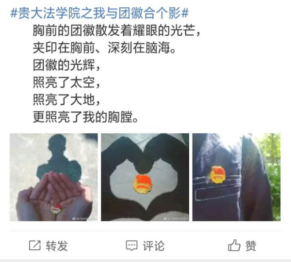 从读小学时起,我们每一个同学便要参加一周一次的升旗活动,当铿锵有力,激昂壮阔的国歌在耳边响起,伴随着徐徐升起的五星红旗,一种莫名的情怀油然而生,那便是对这个自己所在的国家的热爱。每个人内心深处都藏着对祖国的热爱,只是当举行某种仪式的时候,这种感情显得更加强烈。从配戴红领巾,宣读入团誓词,唱团歌,入党,宣读入党誓词,等等这些庄严的仪式,我们内心深处的爱国情怀便被触动。在新时达,我们同样需要仪式感,只是不必和庄严的仪式一般,我们法学162班以自己独特的形式,举行了属于我们个人特色的,与时代接轨的仪式即“我与团徽合个影”。5月30号下午,带上金沙集团1862cc成色之我与团徽合个影的微博话题标签,与团徽来个合照,将这样的精神传递给自己身边的朋友、家人。经过班委的评选,对获胜者颁发证书以及奖品。这样的仪式,不同于庄严的爱国仪式,却能自发引起同学们对爱国主义的理解,不需要宏大的口号,也不是治国平天下的理想,更不是流于形式的爱国主义,而是脚踏实地,从小事做起,从点点滴滴做起,从我做起。对自己负责,对社会负责,厚积薄发,有朝一日在祖国需要的时候贡献出一份微薄之力。