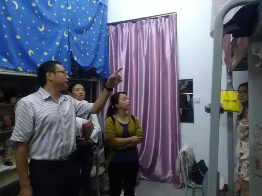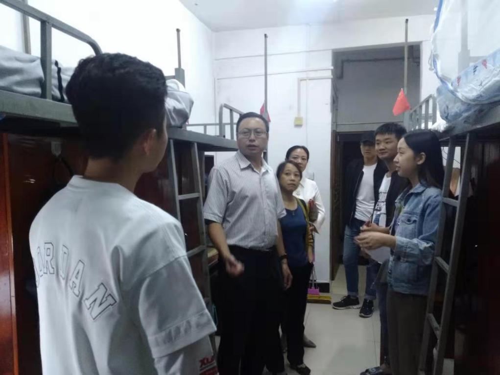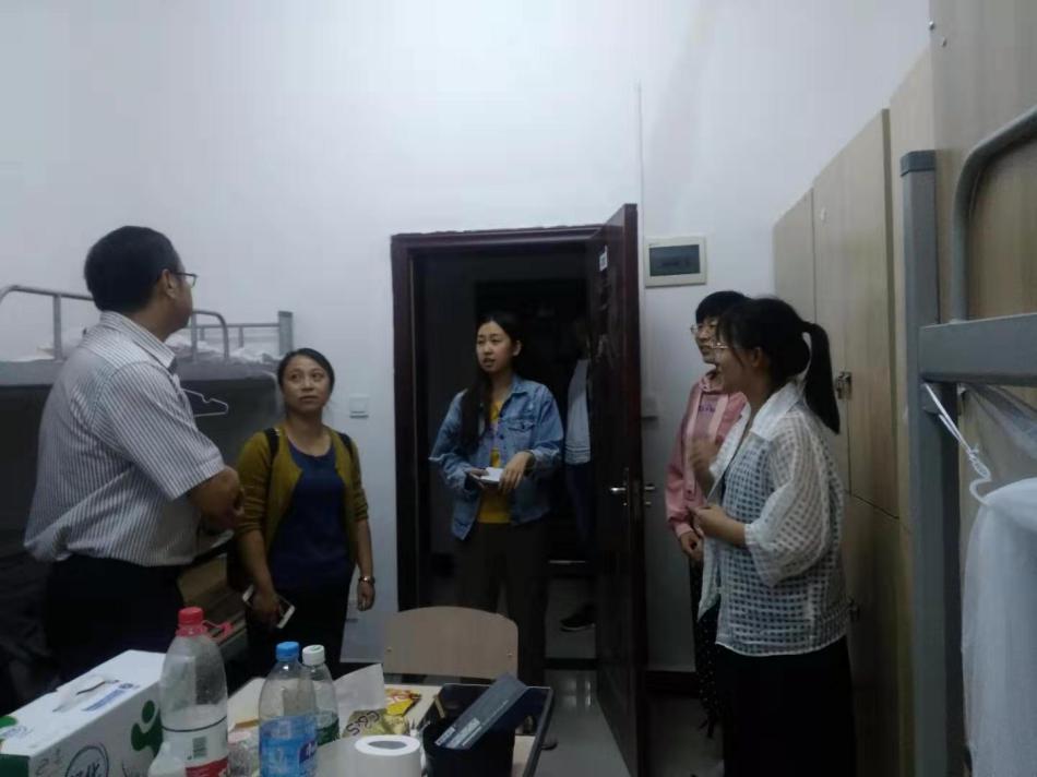 为做好新生入学工作,了解新生住宿情况,2019年9月26日晚上七点半,我院党委胡小兵书记、党委洪影秋副书记、研究生科科长李丽老师和研究生会干部走访了研究生新生宿舍。