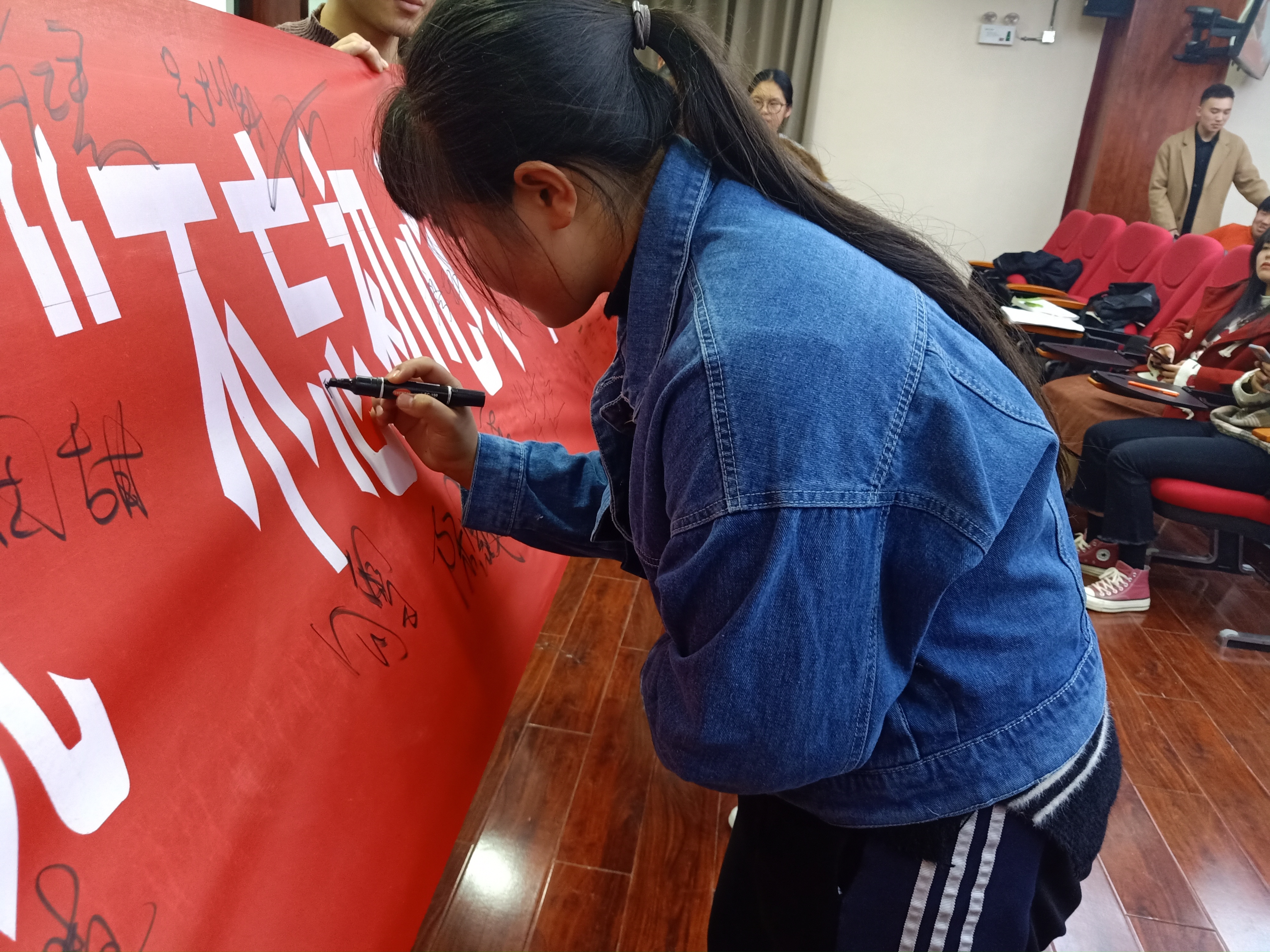 学风关系你我他,建设学风靠大家。优良学风的形成终究还要靠同学们自己,在展示完同学们自己设计的海报之后,各位同学积极在“不忘初心、牢记使命”之“建优良学风,育文明之气”横幅上签下自己的名字,郑重承诺建设学风要从自我做起,要带动同学一起贡献微薄的力量。