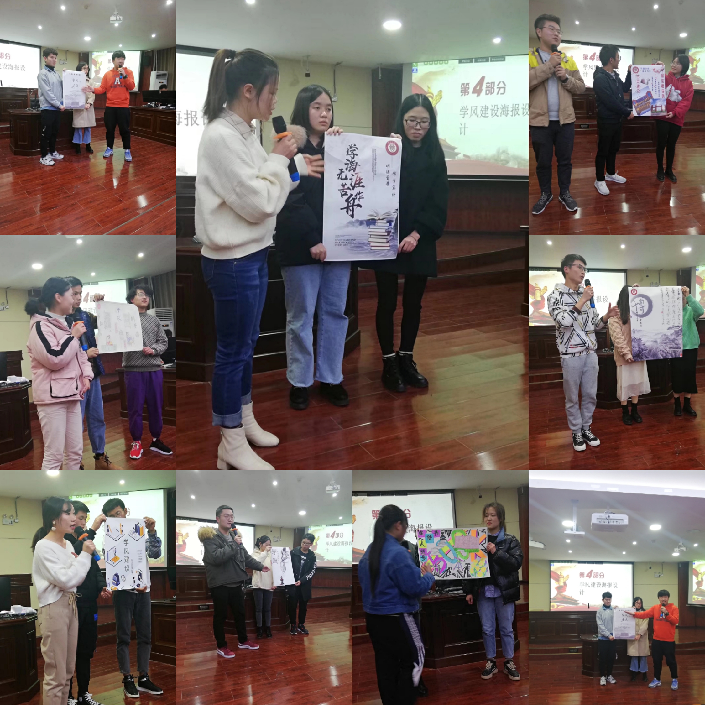 在学风建设主题海报展示环节,每组同学都制作了自己的海报,并依次与大家分享设计理念,多次引用经典典故丰富海报内涵,并为学风建设提出可行性意见,警醒自身要遵校纪,倡导大家共建文明的优良学风。