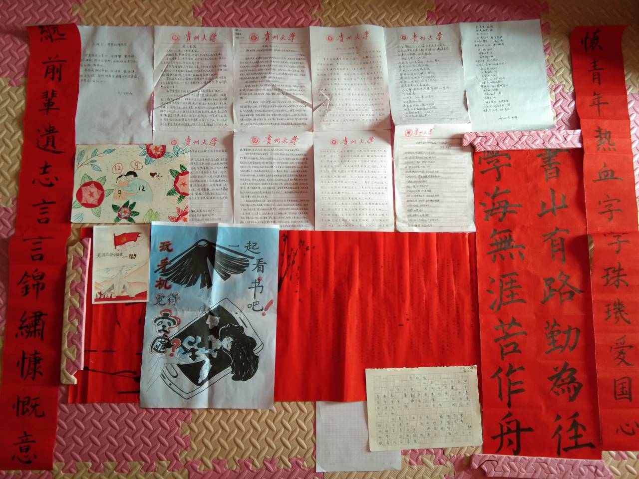为更好促进青年团员对本次主题的学习,鼓励大家通过书画表达自己对主题内容的感悟以及对祖国的热爱,本班同学积极参与并上交作品进行展示分享。