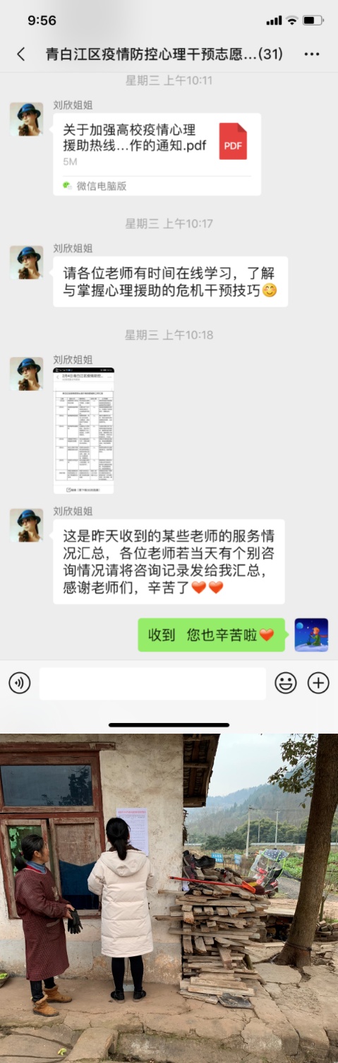 2019级非法1班的张艺同学成为了一名成都市青白江区疫情防控心理干预志愿者,通过自己的学习,利用自己的知识对因为疫情产生心理问题的人进行辅导,缓解他们的心理压力,保障他们的身心健康,向农村地区宣传如何正确的预防病情的传染,营造一个安全的生活氛围。
