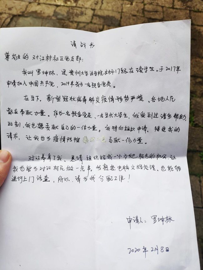 居住在贵州省大方县对江村2017级1班的罗坤林同学在目睹第一个“十四天”结束时防疫工作依然形势严峻、防疫工作人员压力巨大的情况下,毅然决定成为一名志愿者。他为了表明自己的决心,还写了一封“请战书”给村支书。作为一名光荣的预备党员,罗坤林想为养育了自己的家乡服务,想为村民们做点事,希望组织能够给自己一个机会。