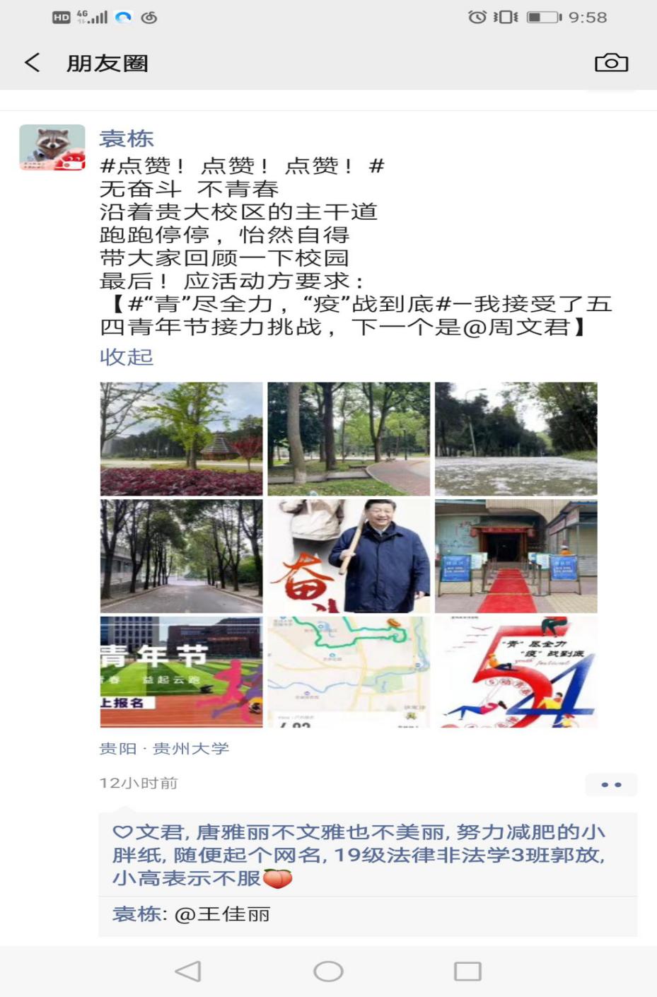 在本次活动中,同学们以“‘青’尽全力 ‘疫’战到底”为主题。考虑到新冠疫情,按照要求,所有参与者只能通过微信“云接力”的方式,在朋友圈以图片、视频、链接等各种新媒体手段发布自己的作品,并鼓励好友为自己点赞,然后@下一位同学参与活动。展示的作品题材丰富、内容多样,包括但不限于摄影、绘画、文章、书法、唱歌、跳舞、诗朗诵、故事讲述等形式和方式。