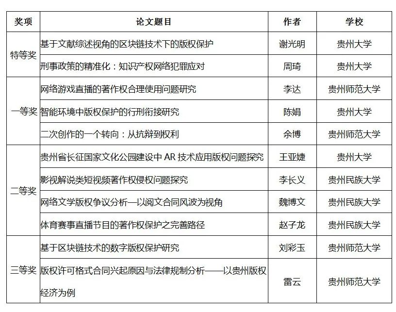 谢光明同学的《基于文献综述视角下的区块链技术下的版权保护》和周琦同学的《刑事政策的精准化:知识产权网络犯罪应对》荣获特等奖;陈娟同学的《智能环境中版权保护的行刑衔接研究》荣获一等奖;王亚婕同学的《贵州省长征国家文化公园建设中AR技术应用版权问题研究》荣获二等奖;金沙集团1862cc成色李萍老师获得优秀指导教师称号。