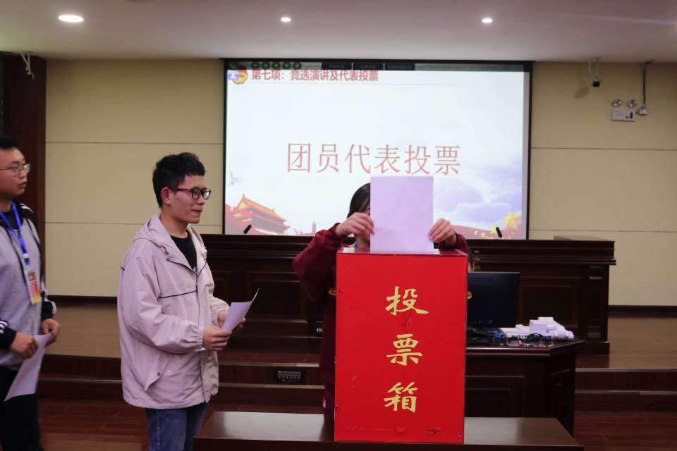 在竞选环节,在通过此次大会的选举办法,主持人为大家简要介绍各位候选人的基本情况后,各位候选人就依次上台,进行精彩的竞选演说。之后,团员代表、学生代表有秩序的排队走向投票箱投出自己手中宝贵的一票。此次有三位团委委员候选人、四位学生会委员候选人参与竞选,其中崔涵昱、关洒当选团委委员,陈琦、陈仕婷、胥果当选学生会委员。在计票期间,同学们共同观看了纪念抗战胜利75周年主题视频。