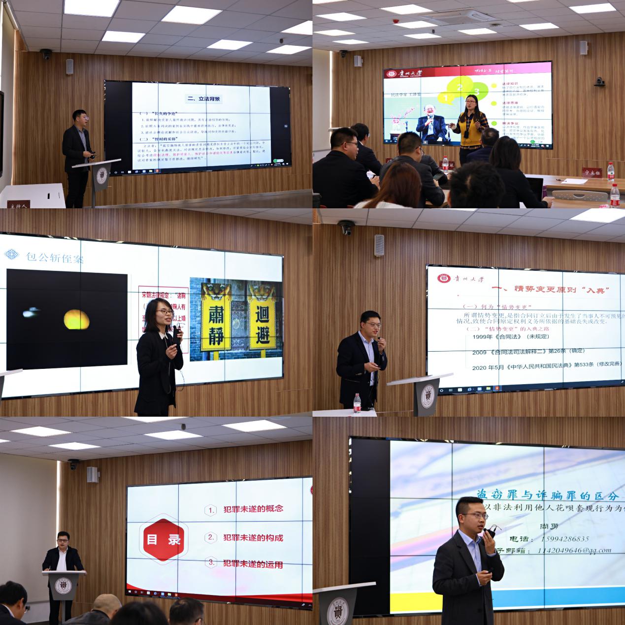 赛上,各位参赛教师进行限时的课程讲授,王磊老师对“高空抛物”进行了深度讲解;杜明强老师对“情势变更原则”进行了精彩分析;曹波老师对“犯罪未遂”章节、尚勇老师对盗窃罪与诈骗罪的区分等内容进行了细致讲解。最后李婷老师和李丹阳老师分别对“刑事回避制度”和“法律人与法律”进行了全方位的描述。他们仪态自然得体,教学思路清晰,语言表达准确精炼,充分展现了各自扎实的教学功底以及独特的教学风格。赛上的气氛无不展现着我院积极进取的精神风貌。台上,每位教师洋溢着教学热情,将自己的所学倾囊相授,台下,各位学生评委仿佛回到了课堂上,聚精会神地吸收各位老师讲授的知识。