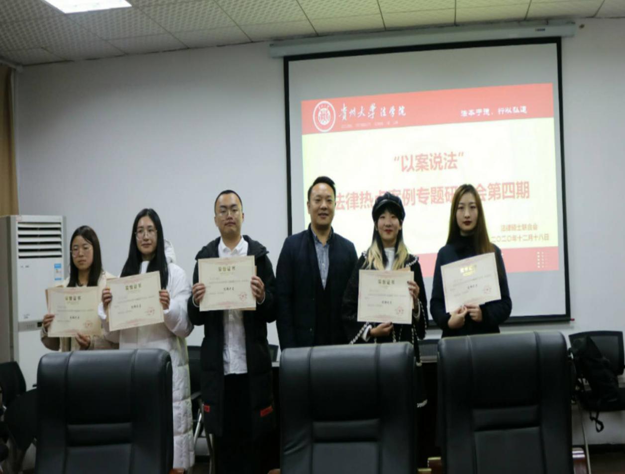 在本期研讨会中,以法律(法学)的黎佳明同学为代表的第一组同学因其突出的表现而最终拔得头筹,罗英文检察官为获奖的同学颁发荣誉证书以及奖品,并与同学们合影留念。