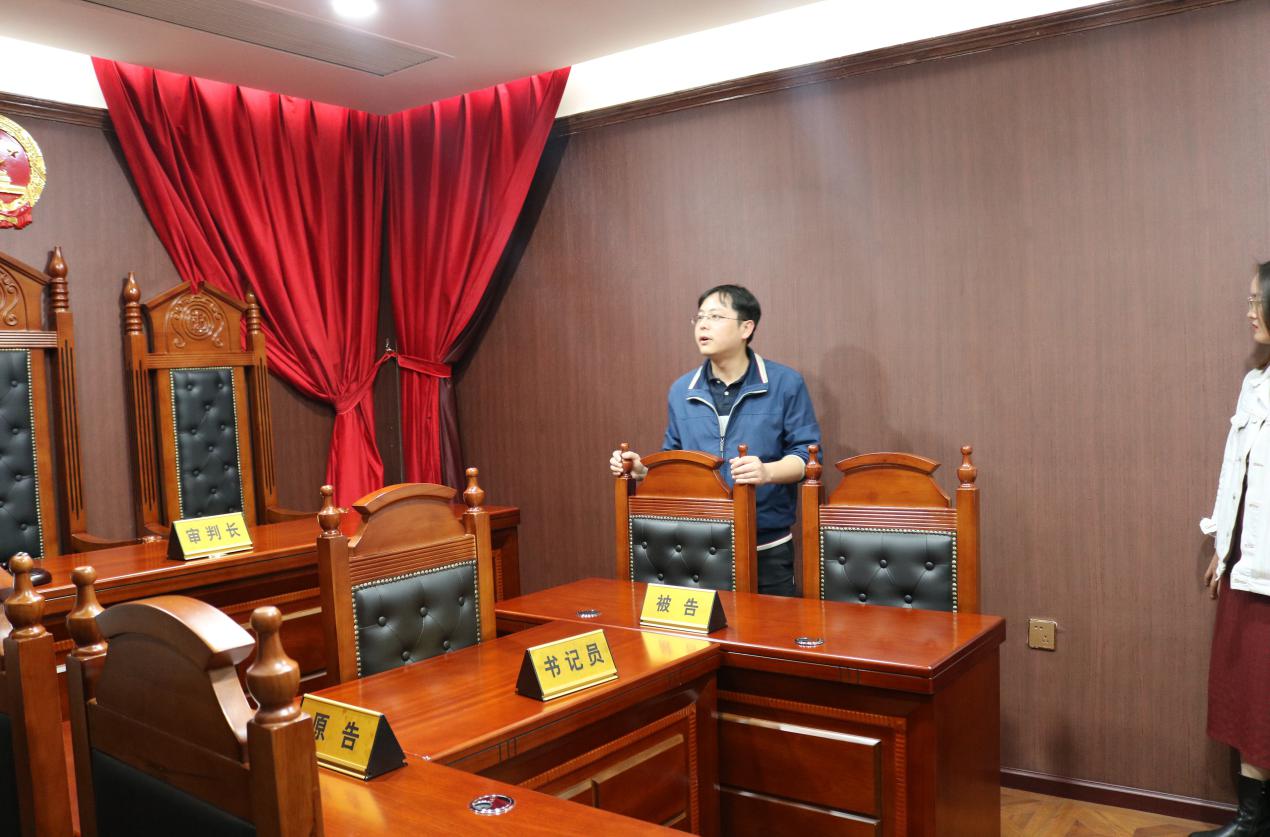 赵儒曦律师带同学们参观了中孚律师事务所。首先印入眼帘的是律所敞亮整洁的大厅,大厅内还设有客户接待区域。客户接待区设置的目的是为客户提供舒适的服务环境,增强客户对律所的信任度与好感度。接下来是律所的文化墙,墙上的14个大字让同学们记忆深刻——“法律需要被信仰,否则它形同虚设。”赵律师介绍道:“这句话体现的是人们必须遵守法律,法律才能发挥出它的价值。作为合格的律师,在处理案件的过程中必须以事实为依据,以法律为准绳。同时也要运用娴熟的职业技能和优秀的专业知识,用法律为当事人争取合法权益。”紧接着,赵儒曦律师带同学们依次参观了律所的党支部、办公区、模拟法庭以及洽谈室。赵律师指出:“模拟法庭是律所的特色区域,每次遇到复杂繁琐的案件时,律师们都会在开庭审理前模拟法庭审理的流程,最大限度地还原案件。同时在此过程中也会得到重要启发,这对案件的开展和辩护工作有着极大的帮助。当遇到涉及当事人隐私的案件时,为保护当事人隐私,律师们都会在洽谈室与当事人交流。”