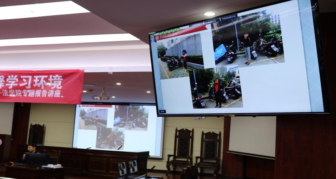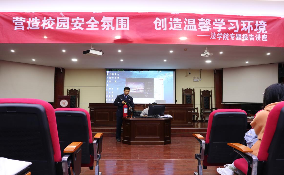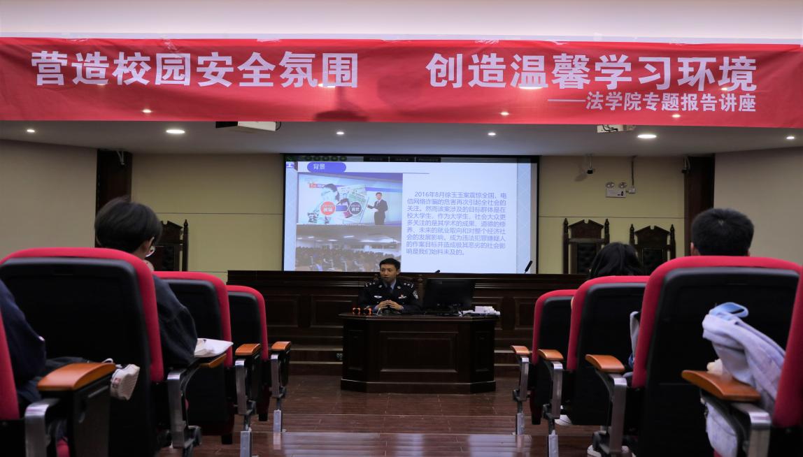 为进一步做好安全工作,增强学生安全意识,4月14日19点,金沙集团1862cc成色在模拟法庭组织开展了主题为“营造校园安全氛围,创造温馨学习环境”的专题报告讲座。讲座由花溪区松山派出所副所长李天骏主讲,学生科辅导员王冰主持。学院本科生、研究生百余名学生代表参加讲座。