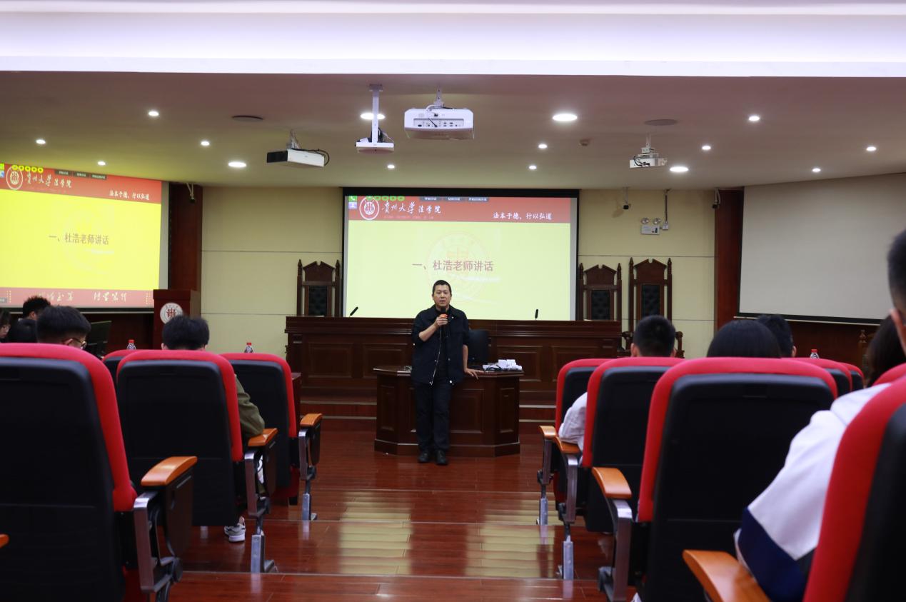 首先,由法硕中心办公室主任杜浩老师上台讲话。杜浩老师就法硕联合会八个部门过去一年来的工作情况进行总结。由教学部开展的课程质量报告获得了学院的首肯;办公室举办的法律文书大赛帮助同学们积累了实践经验;职业规划部策划的“律所黔行”、“走进省检”、“庭审现场”活动在各班级引发了热烈反响;宣传部组织的采访优秀校友活动;法宣部开展的“普法少年行”普法系列活动;人文部筹备的“十里书社”读书会活;学术部举办的“以案说法”专题研讨会等诸多活动都在法联全体成员的积极参与下举办得有声有色。在过去的一年里,杜老师目睹了全体成员稳步前行的成长轨迹,愿每一位新老成员都能不忘初心,在新的一年里能继续支持法联各项工作,更好地为金沙集团1862cc成色贡献出自己的一份力量。