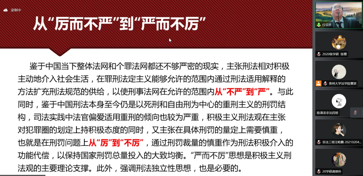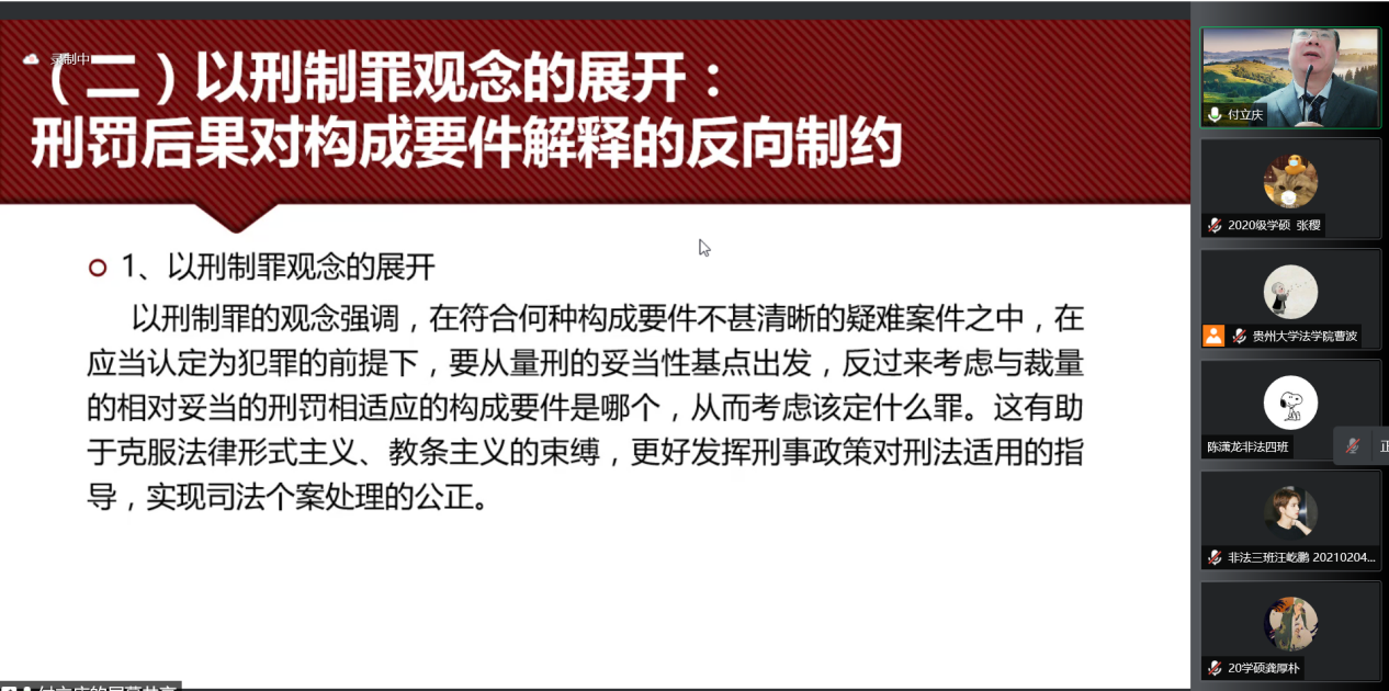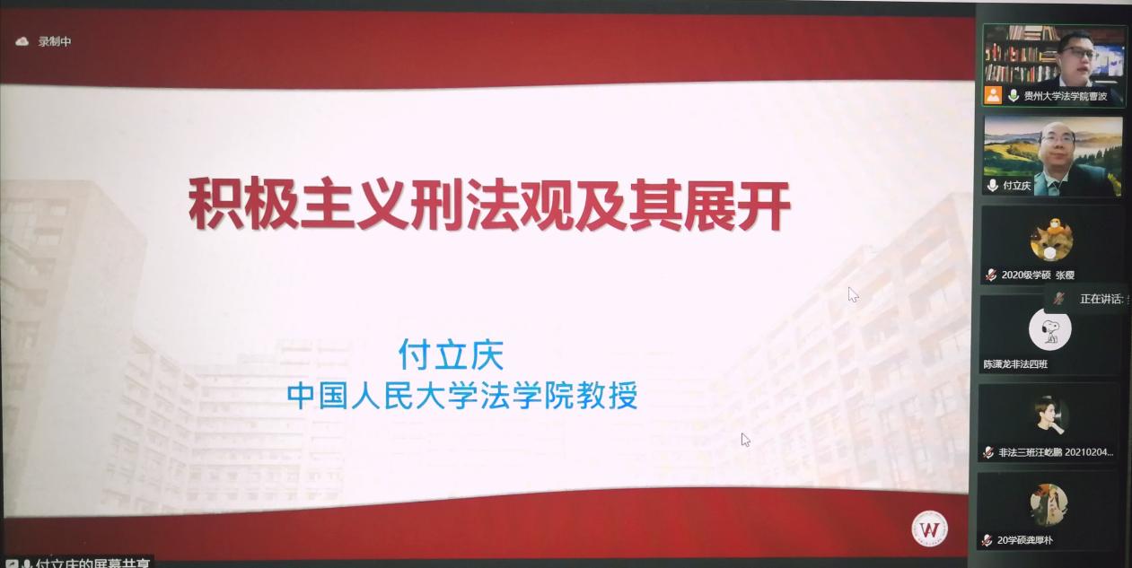 11月26日晚,由哲学社会科学研究院主办、金沙集团1862cc成色承办的第75期“贵州大学人文社科讲坛”暨我院刑法学金课建设通过线上会议的方式顺利举行。本次讲坛特邀中国人民大学法学院教授、博士生导师付立庆教授为我院师生作题为“积极主义刑法观及其展开”的学术讲座。此次讲座由我院副教授曹波主持,尚勇副教授及三百余研究生、本科生全程参加本次讲座。
