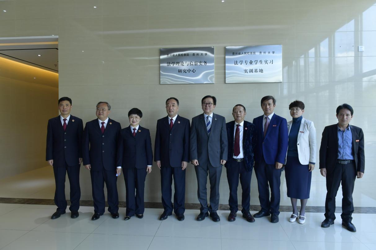 签约仪式完成后,傅信平检察长和李建军书记共同为“法学理论与检察实务研究中心和贵州大学法学专业学生实习实训基地”揭牌。