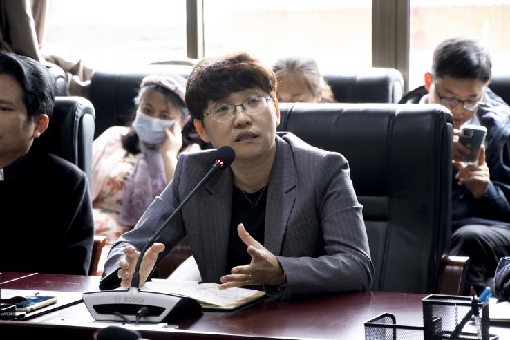 院长冷传莉讲话。她围绕“一名教师如何指导好学生”谈到:第一,认真对待教学要求和教学质量,课讲好,不早退,不迟到;第二,要加强对学生指导,提高论文质量;第三,要持续跟进毕业生就业工作,关注就业率和学生的就业情况。
