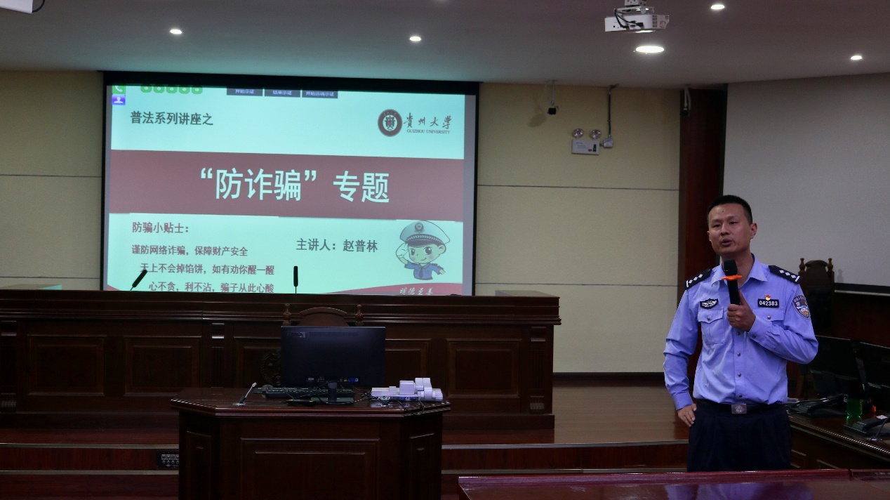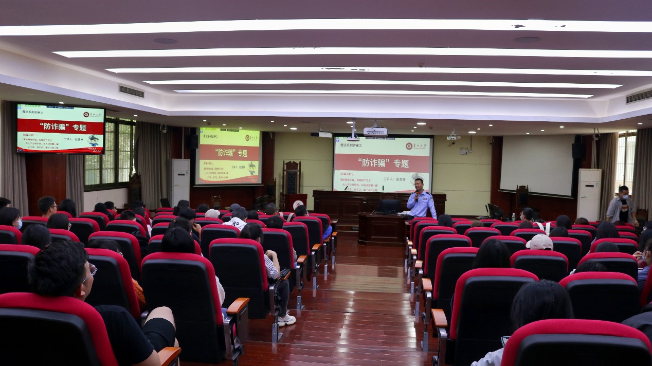 为深入学习贯彻习近平总书记在庆祝中国共产主义青年团成立100周年大会上的重要讲话精神,在维护校园治安,切实保障我校同学的人身财产安全的前提下让当代青年在实现民族复兴的赛道上奋勇争先。2022年5月25日13时,金沙集团1862cc成色有幸邀请到贵阳市花溪区松山派出所赵普林警官为大家开展防诈骗专题讲座。我院一百余名同学都踊跃参与了本场讲座。