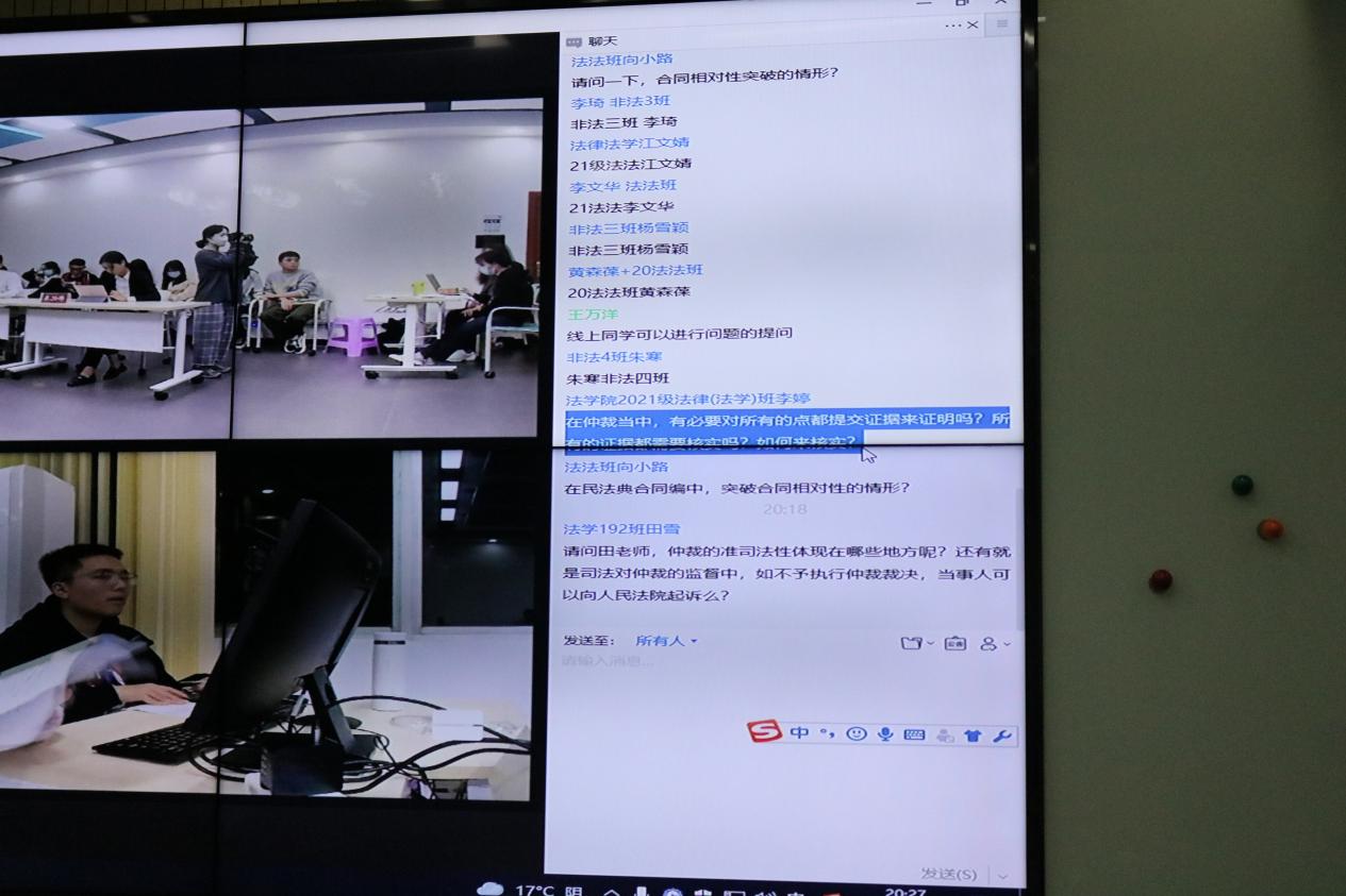 在观众们提问环节。现场同学问老师:仲裁裁决撤销的困难点是什么?老师回答道,仲裁裁决是一经作出立即生效的,生效以后对仲裁裁决不服的话,再向法院提出撤销仲裁裁决,那必须要达到法定的事实和理由。比如仲裁庭的组成或者仲裁的程序违反法定程序的、裁决所根据的证据是伪造的等。这些法定的事实和理由在实务当中发生的可能性几乎没有,因为现在仲裁员和代理人的能力水平都比较高,并且仲裁员是终身责任制等。线上的同学问到:仲裁的准司法性体现在哪些地方?老师回答道,最突出的一点是仲裁裁决和法院判决具有同等法律效力;二是在仲裁当中的一些行为,比如财产保全、证据保全等是可以要求法院来执行的;三是仲裁的执行也是交由法院来实施的。