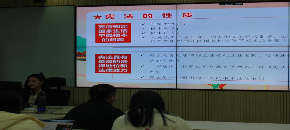 2022年12月4日是第九个国家宪法日,为了提高同学们对于宪法的进一步认识,讲师团将宪法教育作为第一个宣传主题,由讲师团的陈星谕同学进行宪法宣讲教育。她通过播放宪法知识的视频,同学们都兴致勃勃地投入到对宪法的学习和讨论之中。然后通过讲解宪法的历史背景以及基础知识,加深了同学们的宪法意识,同时教导了同学们如何更好的遵守宪法。