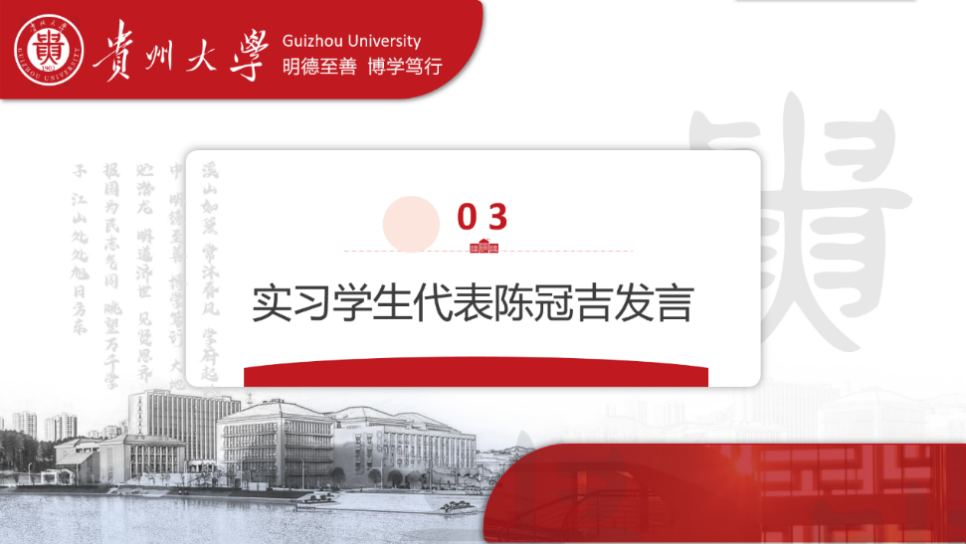 实习学生代表陈冠吉发言,他代表即将参加实习的同学向各位指导实习的领导、老师们表示了由衷的感谢,并向同学们发出倡议,在短暂的实习中运用学校所学,补足知识短板,保持积极向上的心态和饱满的热情。