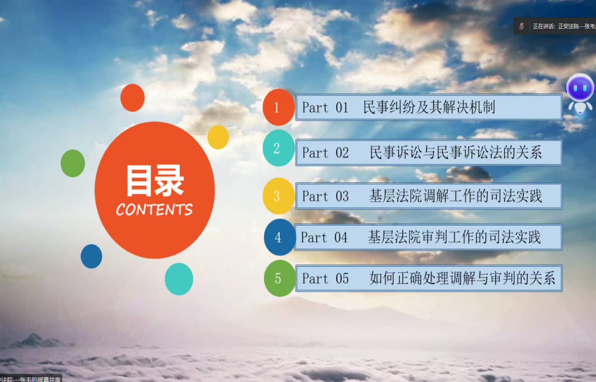 在讲解基层法院调解工作的司法实践这一主要内容时,张韦法官从法院调解的概念、与其他调解的区别、原则、意义、程序等多方面展开,并结合了实务案例带同学们学习基层法院调解的流程。