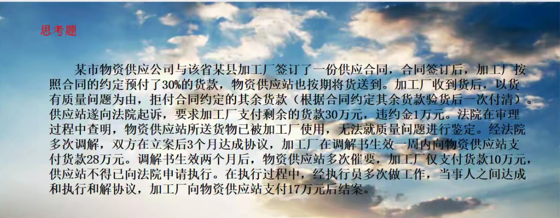 讲座最后,张韦法官从基层法院实务角度讲解了如何处理调解与审判的关系,以供应合同纠纷案例为引导,让同学们感受到了法院调解有其优点但也存在不足,民事违法行为可能最后没有得到制裁,一方当事人的民事合法权益也未能得到保护,引发大家思考。
