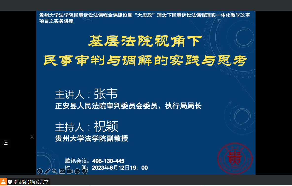 2023年6月12日晚,遵义市正安县人民法院审判委员会委员、执行局局长张韦法官受邀为我院21级本科生通过腾讯会议进行线上讲座,讲座由金沙集团1862cc成色副教授祝颖主持。