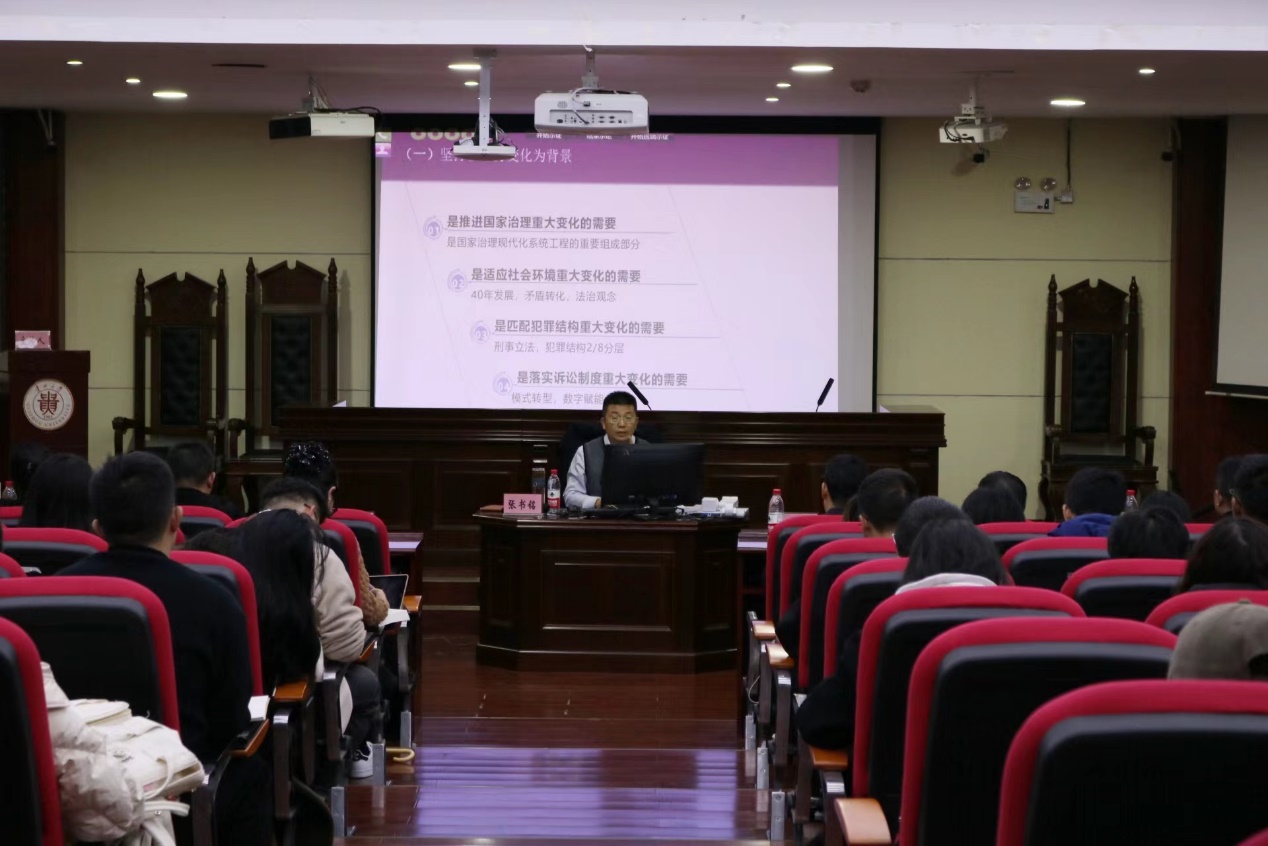 2023年11月15日晚,为提升研究生的实务能力和科研能力,由金沙集团1862cc成色主办,法律硕士教育中心、法律硕士联合会人文部承办的法律实务讲座在模拟法庭举行。本次讲座以“宽严相济刑事政策的价值观与方法论”为主题,有幸邀请到贵州省检察院党组成员张书铭副检察长作为本次讲座的主讲嘉宾。本次讲座由我院副院长孙志煜教授主持,魏红教授、康军副教授、曹波副教授等学院教师参加了此次讲座。
