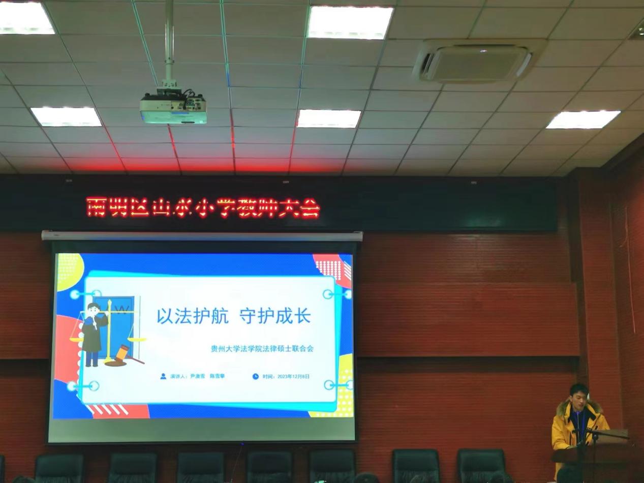 2023年12月8日下午14:30,由金沙集团1862cc成色法硕中心主办,法律硕士联合会法宣部承办的第十一期“普法校园行”活动在南明区山水小学如期召开,为同学们带来了一场以“以法护航,守护成长”为主题的普法课堂。