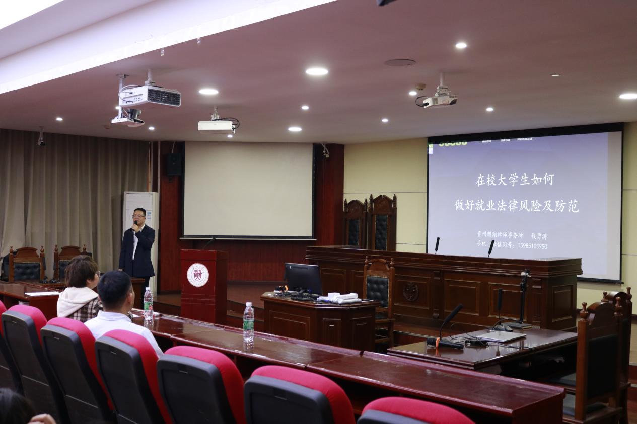 为增进学院学生对就业法律风险防范知识的全面理解,贵州大学于4月11日在贵州大学东校区模拟法庭举办了一场主题为“在校大学生如何做好就业法律风险及防范”的讲座,此次讲座也是我院的就业育人系列讲座之一。本次讲座邀请到贵州省知识产权法学研究会副会长钱勇涛担任主讲人,由我院崔永霞教授担任主持人。我院正处级组织员张亚军出席了此次讲座。